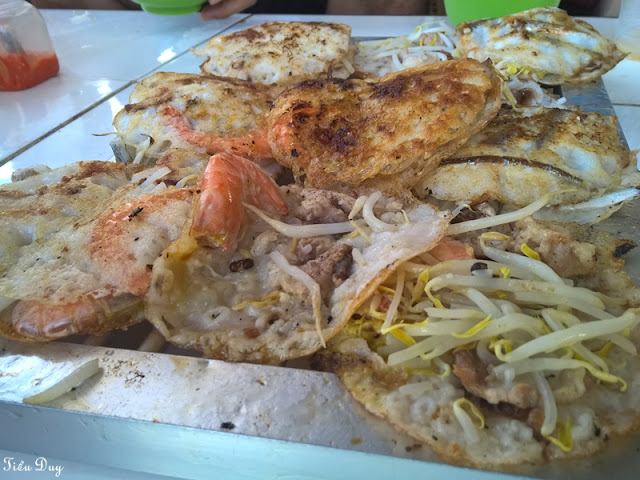 Mỗi chiếc bánh nho nhỏ như hình một chiếc đĩa con, bột tráng mỏng mà không rách, tôm mực thịt hành giá phủ bên trên thơm lựng, màu bột chín hơi ửng vàng thật bắt mắt. Chiếc bánh giòn rụm, vị béo thơm ngọt bùi, ăn một miếng thì ngay lập tức muốn ăn miếng thứ hai.