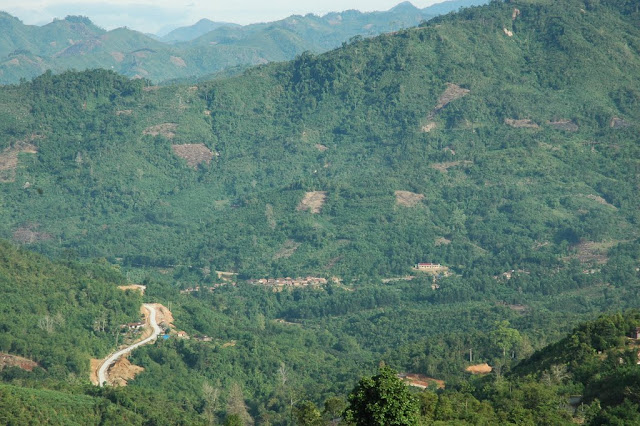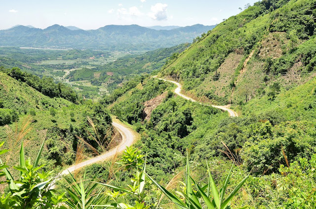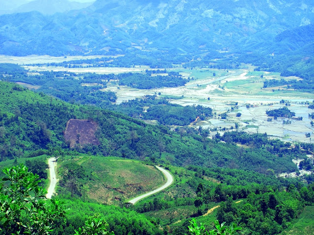 Từ đỉnh đèo có thể phóng tầm nhìn bao quát xuống vùng đất phía dưới. Bốn bề đều là núi non nối tiếp nhau thành một địa hình nhấp nhô không hồi kết. Xa xa phía chân núi là những thửa ruộng bật thang của đồng bào dân tộc thiểu số.